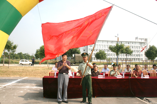 开训仪式上,院长张永生同志郑重地将军训团团旗交到承训部队教官陈海兵手里,标志着本年度新生军训工作正式开始。
