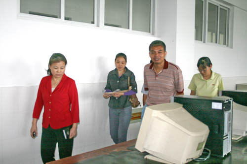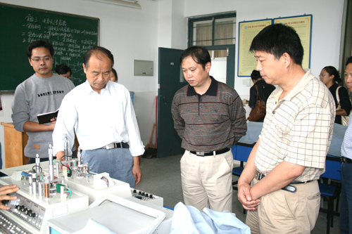自评专家组一行首先来到电子综合实训室,同学们正在专心致志地做实验,专家组一行仔细检查了实验(训)室运行日志及登记表,对实验设施的布局和网线的布局提出了整改意见,要求桌椅凳子要统一,摆放要整齐,登记表格上的登记内容要规范。在其它实验实训教室,专家组成员仔细检查,认真听取情况介绍,提出了许多改进意见。通过检查,比较集中的问题是:卫生状况堪忧,窗台、电风扇、地面、墙角等处灰尘较大,少部分门窗、文件柜、瓷砖断裂失修,楼顶大平台栏锈蚀严重,部分教室的地面上还有口香糖的痕迹,等等。专家组一行安排秘书组成员一一记下,回头抓紧整改落实。当天上午,专家组一行还来到图书馆及学院北门西侧的数控加工中心实地考察,提出了许多有益的意见和建议。