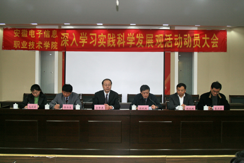 会议决定,成立"必赢766net手机版开展深入学习实践科学发展观活动领导小组",院党委书记胡秋林同志任组长,院党委副书记、院长张永生同志任第一副组长,院党委副书记、纪委书记韩光辉同志任常务副组长,成员由院领导马莉莉、袁益强、姚卿佐、辛颖同志组成。领导小组下设办公室,韩光辉同志兼任办公室主任。学院党委经过研究,决定从创建特色鲜明、优势突出的全省一流高职院校基本思路出发,按照“围绕融入找突破、围绕服务求创新、围绕质量抓内涵、围绕特色做文章”的要求,将“强化内涵建设、提升服务能力、实现科学发展”作为我院的活动主题,以“积极融入合芜蚌自主创新综合配套改革试验区,建设创新型人才培养基地”作为我院的活动载体。通过这一活动载体,广泛深入地开展学习讨论和调查研究,努力做到在国家发展大局中谋划自身发展,科学审慎地明确发展的现实路径、力量来源和特色优势等重要战略问题,把创建特色鲜明、优势突出的全省一流高职院校目标具体化为清晰的思路、强烈的责任和科学的方法。