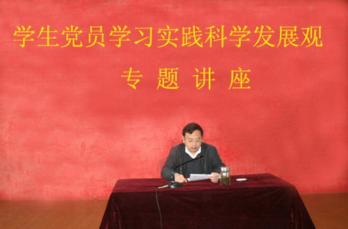 首先,韩书记从充分认识开展学习实践科学发展观活动的重大意义、正确把握学习实践活动的指导思想、主要原则和目标要求等方面,通过在我们身边正在发生的和已经发生的时事热点问题向同学们解释了学习实践活动的三个总体要求、三个着力点和三个学习阶段的任务。韩书记还特别强调,学习实践活动的三个阶段历时半年,是对党员干部的洗礼,更是对学院办学理念和工作思路的梳理。韩书记深情地谈到我们学院办学有三十多年的历史,升格为高职也有八年之久这一实际情况,希望广大学生党员能够在学习实践活动中多给学院建言献策,和学院共同发展。