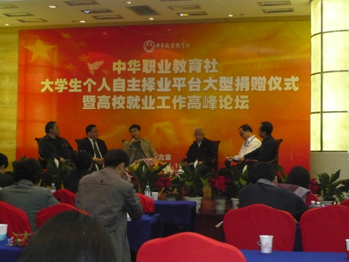 在高校就业促进工作高峰论坛上,翟文胜同志应邀作为访谈嘉宾出席了论坛,并发表了精彩演讲。他围绕“如何把教育与经济社会发展紧密结合起来”这一主题进行了论述,细致介绍了我院工学结合的办学思路与实际做法,并向大家介绍了我院在经济危机背景下的就业工作。主持嘉宾对翟主任的演讲给予了高度评价,并指出,各高校应当发扬统一战线优良传统,共同促进大学生就业工作,营造良好、稳定的就业环境,为构建社会主义和谐社会做出贡献。