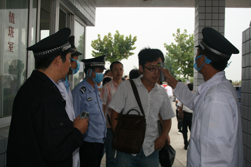 当天上午七点多,学生处、财务处、保卫处、后勤集团和各系部迎新工作人员全部到位,校园内聚集了许多人。为了切实做好甲型H1N1流感的防控工作,按照学院的安排,所有进出学校的人员都必须从东、西两个大门,南、北大门封闭。当天前来送新生的车辆很多,记者在东、西两个大门前看到,保卫处工作人员衣帽整齐,文明有序地指挥车辆停放,部分保卫人员戴上口罩,配合校医院医务工作者忙不迭地对进入校门的人员逐个测体温。接新生的大客车行驶到大门处停下来,新同学和家人们依次下车接受体温检测。