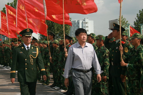 院长张永生在武警蚌埠市支队二大队领导的陪同下检阅军训新生