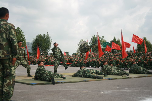 大会进行过程中,武警官兵表演了精彩的擒敌拳和擒敌术,赢得师生们雷鸣般的掌声和喝彩声。