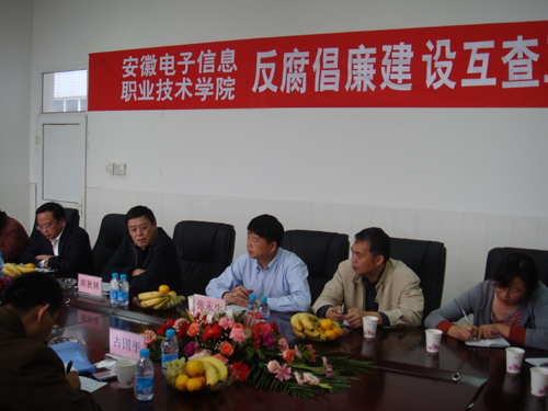 10月21日下午,省教育工委考评组组长皖西学院督导专员杨传连,副组长安徽理工大学纪委副书记王振斌、巢湖学院监审处古国平科长一行三人,对我院贯彻落实《中共安徽省纪委、省教育工委、省教育厅、省监察厅关于加强高等学校反腐倡廉建设的意见》的情况进行检查考评。