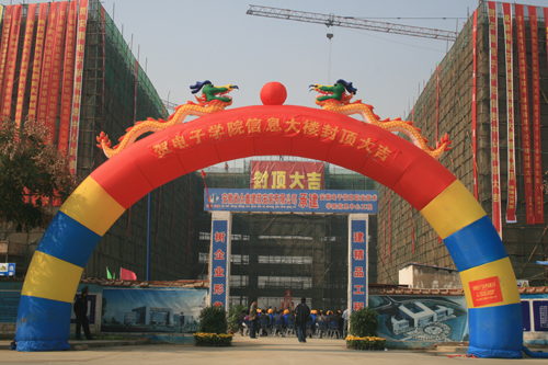学院自2008年12月开工建设以来,在众鑫建筑有限公司和学院行政管理处及相关部门工作人员的共同努力下,加班加点,团结协作,确保了工程施工建设安全、质量和进度。主体工程正式封顶后,工程将进入装修和附属设施建设阶段,学院将与施工单位继续加强协作,争取尽早使信息大楼投入使用,以便于学院进一步加大实验实践课教学的开课量,增强学生的动手能力,提高人才培养质量。