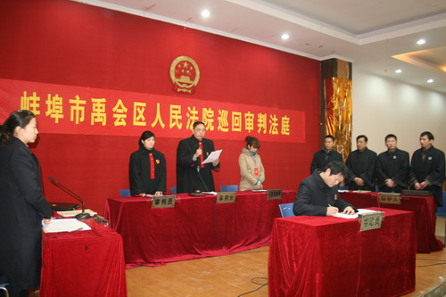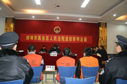 “我来自广西农村,家境很贫穷,读书时借了不少钱,毕业后没有找到合适的工作,在‘朋友’的介绍下来到了蚌埠,误入传销组织,我现在非常后悔,请在座的大学生们一定要引以为戒,将来走上社会要擦亮眼睛!”11月18日下午,在庄严的国徽下,一场特殊的审判正在学院行政楼三楼大学生活动中心举行。审判长、审判员、人民陪审员组成了合议庭,禹会区人民检察院两名检察人员受指派担任国家公诉人,淮河律师事务所四名身着律师袍的律师免费为四被告提供了法律援助,数名穿戴整齐的法警分列法庭两侧,更增添了法庭的威严气氛。