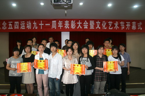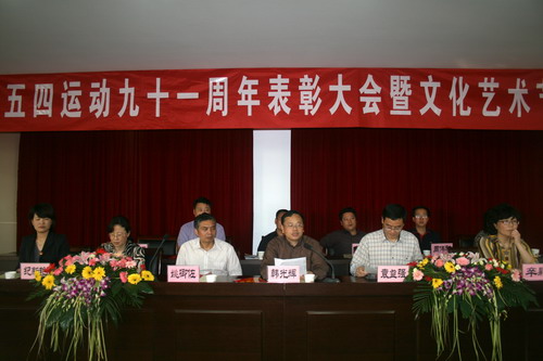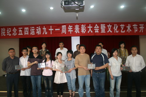 大会在雄壮的《国歌》、《团歌》声中开幕,韩光辉同志作了重要讲话,对全院团员青年致以节日的问候,对受表彰的同学表示衷心的祝贺。袁益强分别宣读了学院各级团组织和团员个人受市级和院级表彰的同志名单。院领导分别为获奖者颁奖并合影留念。