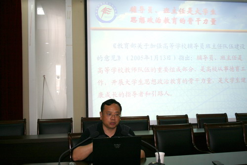 培训会上,韩光辉认为,辅导员首先应该是指导员,是大学生的人生导师、良师益友;其次是咨询员,为学生答疑解惑;然后是服务员和管理员,为学生的生活、学习提供帮助和服务。“上面千根线,下面一根针”,形象地说明了辅导员的辛苦。辅导员应该乐守自己的职业,乐业源自于自我工作责任感的增强,源自于自我职业成就感的获得,源自于自我工作幸福感的积累。他分别引用马斯洛“五层次论”、徐匡迪院士对教育的诠释、教育家霍懋征对教育的理解等,深入浅出地回答了“辅导员职责与教师行管人员职责的关系”、“辅导员的得与失”、“教育是核心,管理是保证”、“学风建设、安全稳定与班级基础工作”等问题。