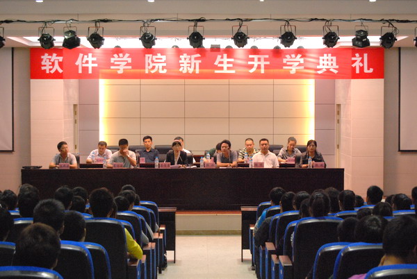 本网讯 天高云淡,金秋送爽, 9月14日上午,2012级软件学院新生入学教育大会在信息楼一楼会议中心隆重召开,软件学院院长苏传芳,党总支书记韩冰,副院长杨明、张放及科大讯飞企业代表在主席台就座。