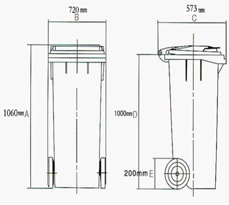 4、产品材质说明:桶体及桶盖、销子使用100﹪高密度聚乙烯(要求进口原材料)一次性注模成型无接缝。 产品材料中注入高质量防紫外线原料占3%,颜料色素占5%以确保塑料桶颜色保持鲜艳耐久不褪色长达5年。 桶体密闭有盖,桶盖与桶体有四条加强筋连接,连接处牢固。 轮轴采用Q235钢材料,穿心轴轮子,表面电镀锌12μ的厚度,防锈时间为10年。 滚轮采用噪音小的橡胶实心轮,硬度测试达到65±5以确保清运过程动作平稳,每轮承载能力