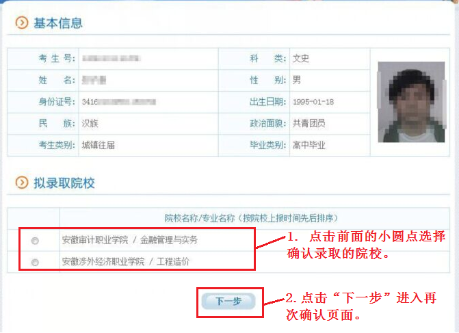 2. 用自己设定的密码重新登录,进入录取院校确认界面: