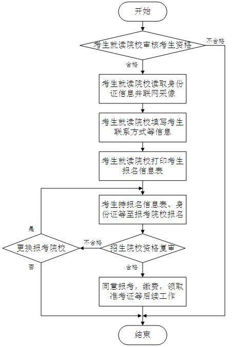 学院招生就业处使用第二代居民身份证阅读器联网读取考生第二代居民身份证信息,同时使用摄像头联网采像。考生报名基本信息录入完成后,报名系统即时生成考生号。通过报名系统打印的考生报名信息表,填写报考院校、专业等信息后到招生院校现场报名。招生院校负责资格复审,复审通过的考生方可领取准考证。各校现场报名确认时间应在招生章程中明确。