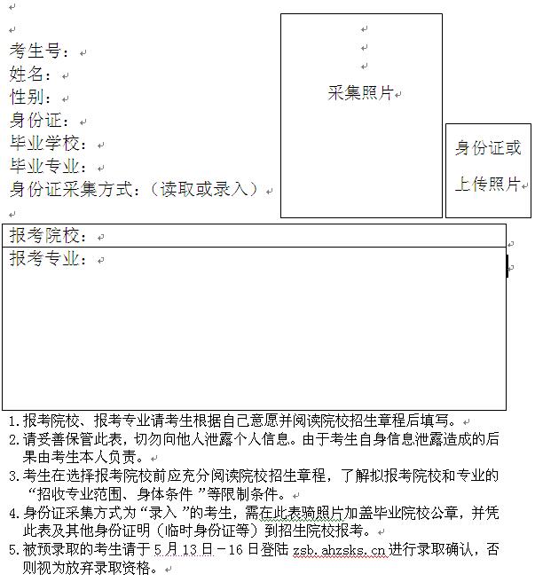 所有被预录取的考生需在5月13日-16日登陆zsb.ahzsks.cn进行录取确认。被多所院校预录取的考生只能选择一所院校确认录取,一经确认,任何人不得更改。已被预录取但未网上确认的考生将视为放弃录取资格。