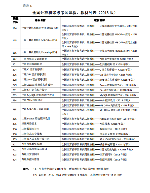 附表3:全国计算机等级考试课程、教材列表(2018版)