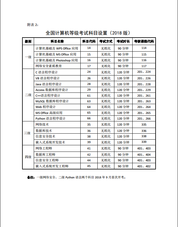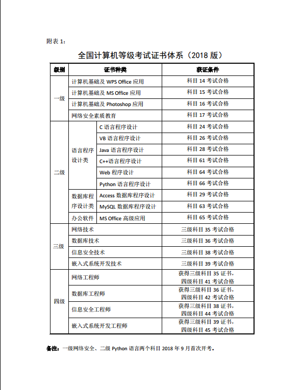 经第六届全国计算机等级考试(NCRE)考委会会议决定。从2018年3月开始,将实施2018版考试大纲,并按新体系开考各个考试级别。具体调整内容如下: