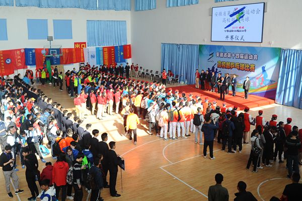 本网讯 4月10日上午,由安徽省人民政府主办,省体育局、省教育厅、蚌埠市人民政府承办,必赢766net手机版协办的省第十四届运动会高校部乒乓球比赛正式开赛。学院党委书记石象斌,党委副书记、院长王国武,蚌埠市政府副秘书长邹传明,蚌埠市体育局局长张亚,省体育局青少处处长文斌,蚌埠市教育局副局长刘善训,省教育厅体卫处副调研员储修杰,高校部乒乓球比赛裁判长马志军出席开赛仪式。开赛仪式由学院党委委员、副院长姚卿佐主持。