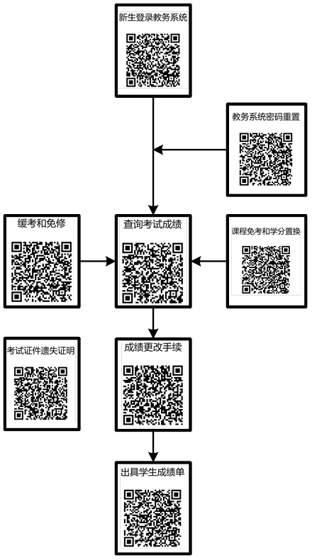 教务处梳理学生使用教务系统办理相关手续的需求,秉承方便学生查询,简化办事流程的原则,逐条修订学生登录教务系统、密码重置、查询成绩、缓考免考手续、成绩变更手续、出具成绩单等相关操作流程或办理流程,生成相应二维码,编制出学生使用教务系统相关事务办理流程(见附件),学生借助微信或QQ“扫一扫”即可查询办理流程和下载附件。
