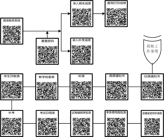 教务处梳理教师使用教务系统办理相关手续的需求,秉承方便教师查询,简化办事流程的原则,逐条修订教师登录教务系统、密码重置、录入成绩、查询成绩和教学管理相关事务操作流程或办理流程,提供相应链接和二维码,其中借助微信或QQ“扫一扫”二维码即可查询办理流程和下载附件。