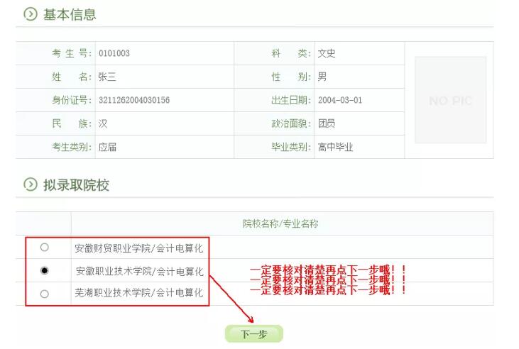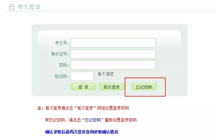 二、用自己设定的密码重新登录,进入录取院校确认界面: