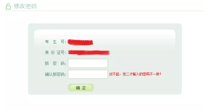 输入考生号,身份证号,点击“发送短信验证码”按钮后,系统会随机发送6位数字验证码至考生报名时所填的手机号上;填写完短信验证码,点击“确定”,跳转至考生修改密码页面,设置考生登录密码。短信验证码只能发送5次,请考生谨慎操作。