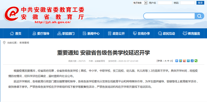 延迟开学期间,各级教育行政部门要加强管理和指导,各级各类学校要充分发挥在线教育平台和网络媒体作用,为学生提供辅导、答疑等线上教育教学活动,做到停课不停学。严禁各级各类学校在开学前组织线下教学等聚集性活动,严禁各类培训机构在开学前开展线下培训活动。(来源:安徽省教育厅)
