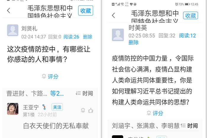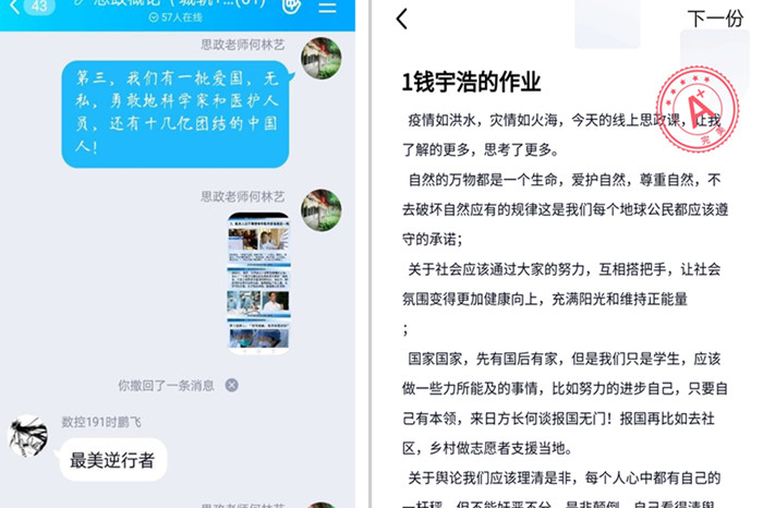 “今天的线上思政课让我了解了更多,思考的更多……”,钱宇浩同学在课后作业中这样评价第一堂思政课。为了上好非常时期的思政课,学院全体思政课教师发挥团队优势,多次开展集体备课,熟练掌握线上教学技术要求,相互学习,资源共享。一周以来,每位思政课教师根据统一课件和教案,进行了各具特色的演绎和阐释,在强信心、暖人心、聚民心的思想战场上,及时回应学生困惑,解开思想疙瘩,让青年学子感受到社会大课堂和思政小课堂同频共振的魅力。