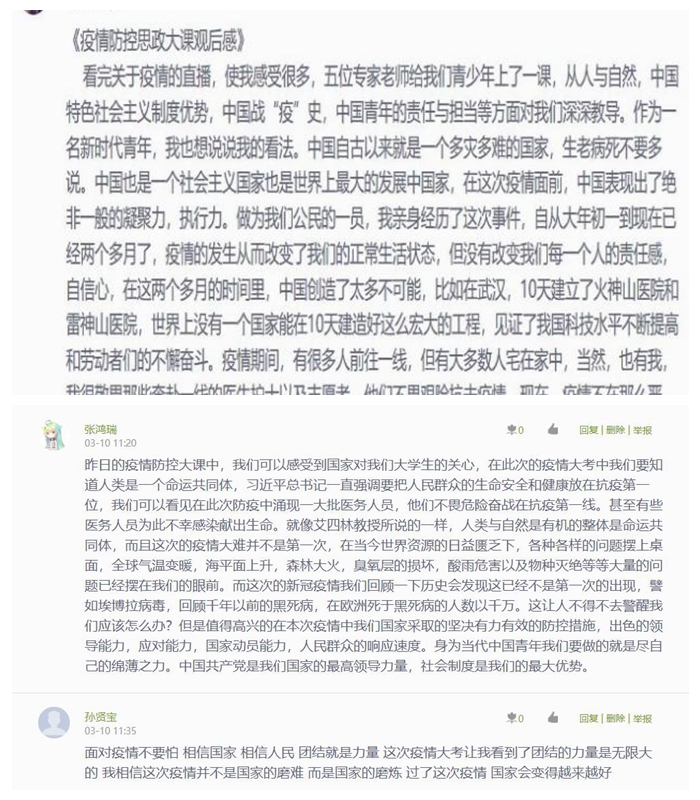软件171王郑同学说:“此次思政大课令我受益匪浅,四位专家深入浅出,用简单易懂的语言向同学们讲述了中国在疫情面前的大国风范,让我深深感受到我们国家在疫情中展现出强大组织动员力、行动力、战斗力。我坚信,有党中央的坚强领导,有万众一心凝聚起的坚强力量,我们一定能够打赢疫情防控的人民战争、总体战、阻击战!”物联网181王弦同学说:“自疫情发生以来,在做好自我防护的同时,我也积极配合当地村委会,担任防控志愿者,为防疫工作贡献自己的一份微薄之力,我感到非常自豪。”营销191吴云飞同学说:“看到在防疫抗疫中涌现的先进人物、典型事迹和抗击疫情故事,使我们更加坚定在党中央坚强领导下,众志成城、同舟共济打赢疫情防控人民战争、总体战、阻击战的信心和决心。”汽修181付文琅同学说:“没有一个冬天不可逾越,没有一个春天不会来临,相信有祖国作为坚强后盾,疫情防控终将会取得胜利!” 机电1991 张熙鹏同学表示:“作为一名普普通通的学生,虽然我还没有步入工作岗位,但我也愿意奉献自己的一份力量,冲锋在前,当好疫情防控‘排头兵’;争当表率,当好疫情防控‘急先锋’;及时报告情况,当好疫情防控的‘守门者’;引导发动身边人,当好疫情防控‘宣传员’;积极参加志愿服务,当好疫情防控‘搬砖人’。”软件学院伏晓阳同学说:“ ‘疫’中有情。疫情的发现、蔓延、防控,以及到如今的基本稳定,无数中华儿女抛却了自身的幸福生活,舍小家为大家,上演了一幕又一幕可歌可泣的感人故事。许多年轻的医务工作者身先士卒,冲锋于抗疫一线,为中华民族的伟大复兴保驾护航;越来越多的青年志愿者服务于城市社区、村庄巷道之中,为群众送上‘爱心菜’‘暖心茶’;无数青年学子响应国家号召,放弃了春节游玩拜访的机会,居家隔离……这便是青年学子的责任与担当,这便是鲁迅先生所言的中华民族之脊梁。”网络专业社招班的同学也表示:“面对疫情,社招班同学大部分都有工作在身,很多同学已经返岗上班,通过本次学习,同学们认真听讲,受益很深,我们要在做好本职工作的同时,减少对疫情的恐惧,与国家一起打赢这场战役!”