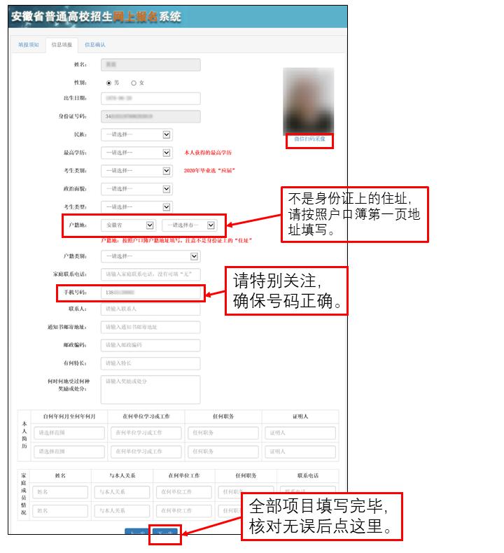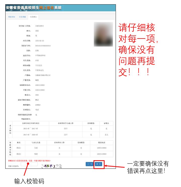 请再次核对本人所填信息是否有误,若有更改,请点击“上一步”,进入填报页面进行修改。确认无误后,填写页面下方的验证码,并点击“提交”按钮提交信息。