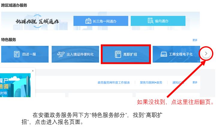 4. 登录后在网页中下部找到“特色服务”栏目,点击“高职扩招”即可进入高职扩招报名信息填写页面。