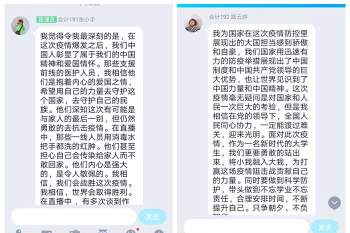经济管理系党总支书记乔刚表示,这是一堂有深度、有高度、有温度的思政大课,知名专家学者,特别是一线医护人员讲授战“疫”大课,既有权威性、说理透彻,又接地气、指导性强。作为一名党员干部和思政工作者,要善于化危危机,挑战当前显担当,坚持以学生为中心,落实立德树人根本任务,抓实抓细“三全育人”综合改革试点工作。