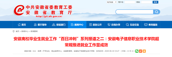 本网讯 6月10日,安徽教育网教育要闻栏目以“安徽高校毕业生就业工作‘百日冲刺’系列报道之二:必赢766net手机版超常规推进就业工作显成效”为题,报道学院创新服务、多措并举,确保实现毕业生高质量和更充分就业。