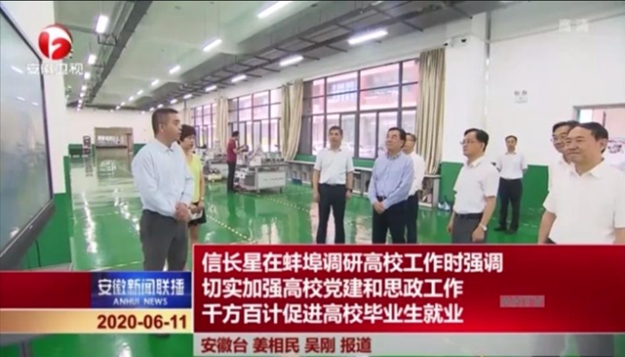 本网讯 6月10日上午,省委副书记信长星来学院调研指导毕业生就业工作。省委副秘书长傅博,蚌埠市委书记汪莹纯,省委教育工委书记钱桂仑,蚌埠市委副书记曹哨兵,省人力资源社会保障厅副厅长刘少华,学院党委书记石象斌,党委副书记、院长王国武等陪同调研。
