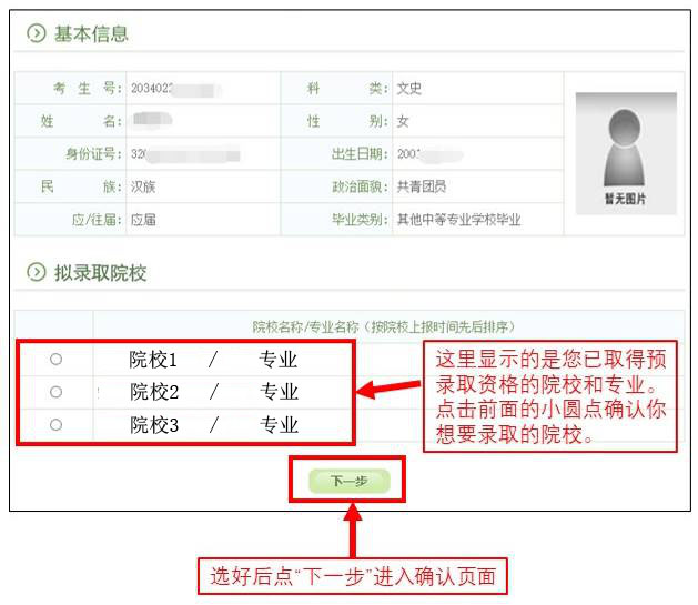 根据省教育厅的要求,为扩大考生选择权,考生可选报最多3所院校,一名考生可取得多所院校预录取资格。考生只有在规定时间内选择一所院校确认录取。录取院校一经确认,任何人不得更改。已被预录取但未网上确认的考生将视为放弃录取资格。