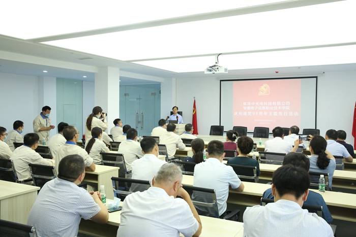 本网讯 为庆祝中国共产党成立99周年,进一步激发党员干部干事创业热情,7月1日,学院组织党员干部赴蚌埠中光电科技有限公司联合开展主题党日活动。学院党政领导石象斌、王国武、韩光辉、马莉莉、辛颖、陈再文,中建材蚌埠玻璃工业设计研究院副院长、总工程师,蚌埠中光电科技有限公司董事长、总经理张冲,蚌埠中光电科技有限公司副总经理侯建伟,副总经理江龙跃,党支部书记、副总经理曹志强等出席活动。学院、蚌埠无线电管理处和蚌埠中光电科技有限公司党员代表参加活动。