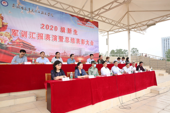 本网讯 猎猎旌旗,飒爽英姿,沙场秋点兵。9月29日下午,学院举行2020级新生军训汇报表演暨总结表彰大会。学院党委书记石象斌,党委副书记、院长王国武,党委副书记、纪委书记韩光辉,党委委员、副院长马莉莉,党委委员、副院长姚卿佐,党委委员、组织人事处处长辛颖,党委委员、院长助理陈再文,陆军装甲兵学院蚌埠校区教练勤务营警通勤务连何雷超指导员,陆军装甲兵学院蚌埠校区教练勤务营外训三队王洋参谋出席大会。学院各部门负责同志、全体2020级新生及辅导员参加活动。大会由韩光辉主持。