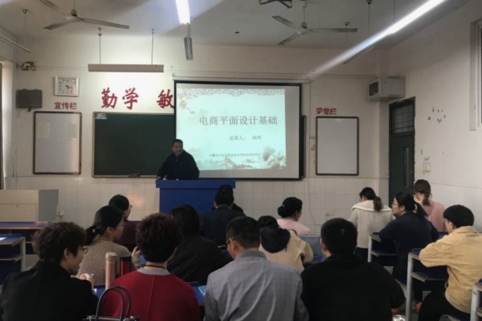 此次公开示范课主要分为两个环节,即:说课环节和授课环节。杨明老师讲解《电商平面设计基础》,采用任务驱动教学方法,将信息化教学融入到整个教学过程中,并结合课程思政、时事热点以及电子商务专业学生的专业方向,讲解演示“双十一”宣传海报的制作。吴冬霞老师阐述了课程内容、教法、学法、考核方法等,并指出可以从态度意愿、职业技能、工作纪律三个方面开展育人工作。在授课环节,吴老师围绕管理会计中“成本性态分析”,展开授课示范。