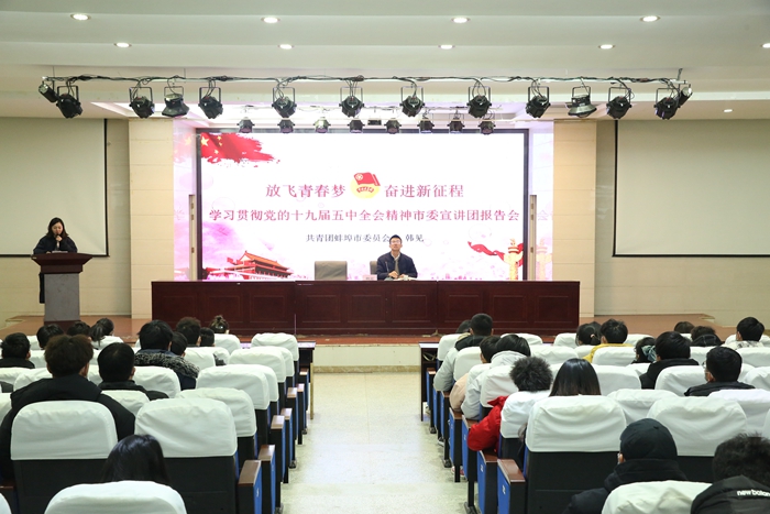 本网讯 按照市委统一部署,12月21日下午,“放飞青春梦 奋进新征程”学习贯彻党的十九届五中全会精神市委宣讲团报告会在学院学术报告厅举行。市委宣讲团成员、团市委副书记(主持工作)韩见作宣讲报告。学院学生代表200人参加宣讲报告会。