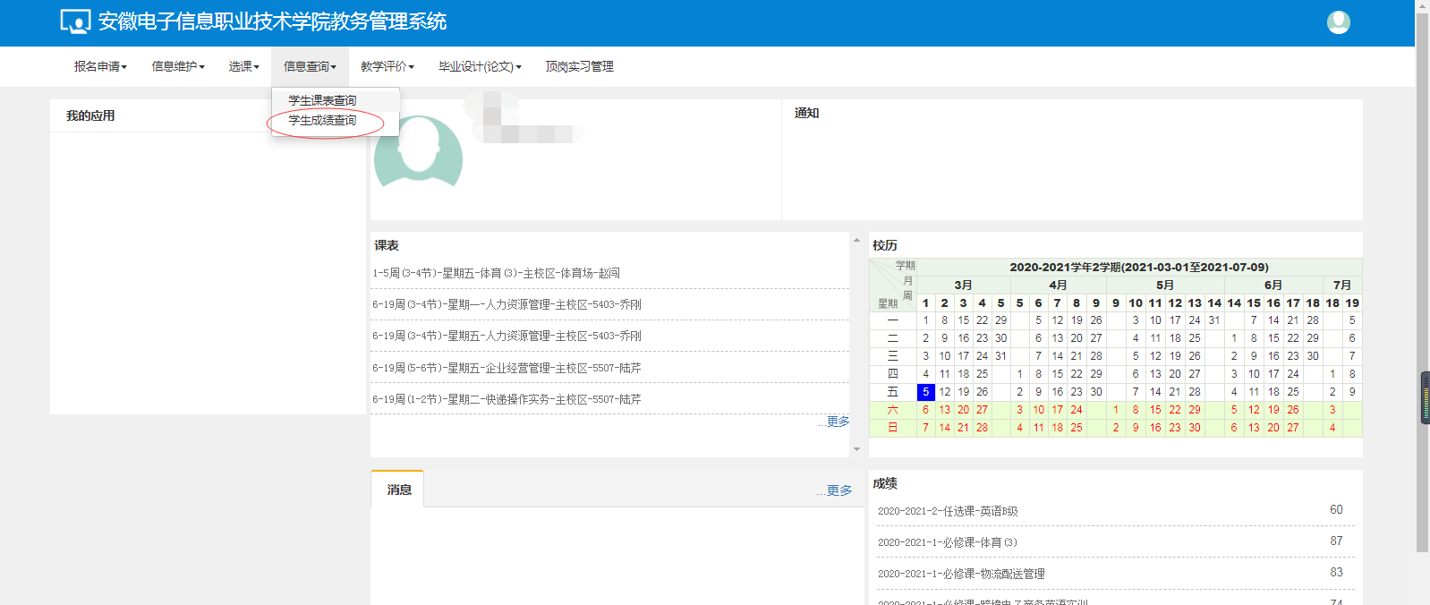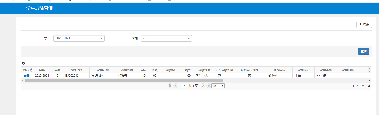 2.学生进入信息查询--学生成绩查询页面,在查询框内学年选择“2020-2021”、学期选择“2”,点击【查询】按钮,即可查询到英语B级成绩。