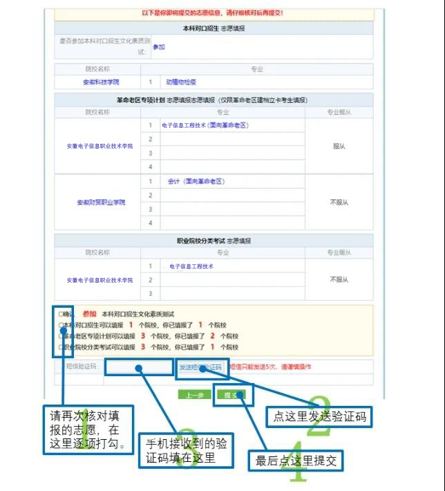 3.首次登陆和志愿提交时均会发送短信验证码,如遇无法接收短信验证码、遗忘考生号等问题,请联系报名点或当地招办。