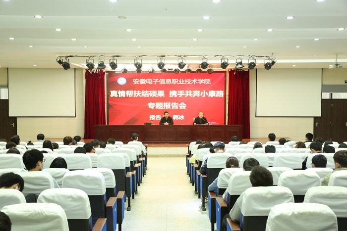 本网讯 为大力弘扬脱贫攻坚精神,全面展示我国脱贫攻坚成果,3月29日下午,学院在信息中心学术报告厅举行脱贫攻坚专题报告会,宿松县陈汉乡玉屏村第一书记、学院驻村工作队队长韩冰应邀作专题报告,学院师生代表近200人聆听了报告,思政部主任曹晓军主持报告会。