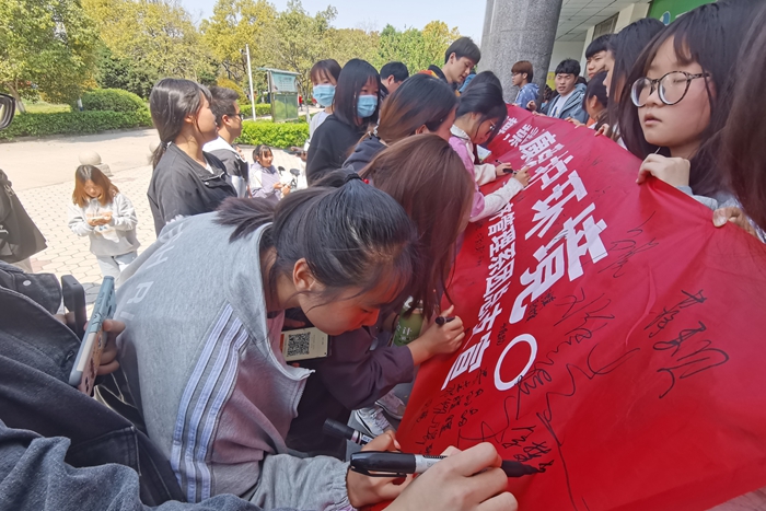 本网讯 为培养广大学子良好的文明习惯,促进“健康校园 无烟校园”建设, 4月25日中午,经济管理系团总支在食堂门前组织开展“拒绝烟草 从我做起”禁烟签名活动。