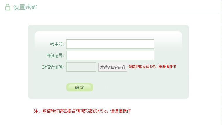 输入考生号,身份证号,点击“发送短信验证码”按钮后,系统会随机发送数字验证码至考生报名时所填的手机号上;填写完短信验证码,点击“确定”,跳转至考生修改密码页面,设置考生登录密码。请勿频繁点击“发送短信验证码”按钮。