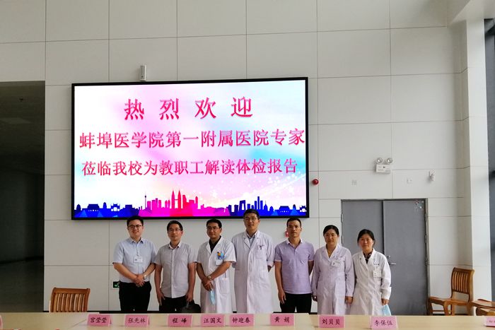 在义诊活动现场,围满了许多携带体检报告前来咨询问诊的教职工。来自蚌埠医学院第一附属医院普外科、胸心外科、心内科、妇科、内科等科室的专家们仔细观看教职工的体检报告,认真倾听主诉,悉心为教职工讲解生活中需要注意的事项,同时还传授并普及了一些工作中常见病的预防和治疗。