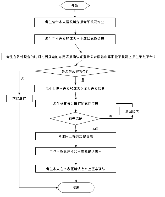 考生本人在指定地点、指定时段内按照事先填好的志愿预填表上网录入志愿信息。志愿录入完成提交后,现场打印志愿信息确认表并由考生本人当场签字确认。