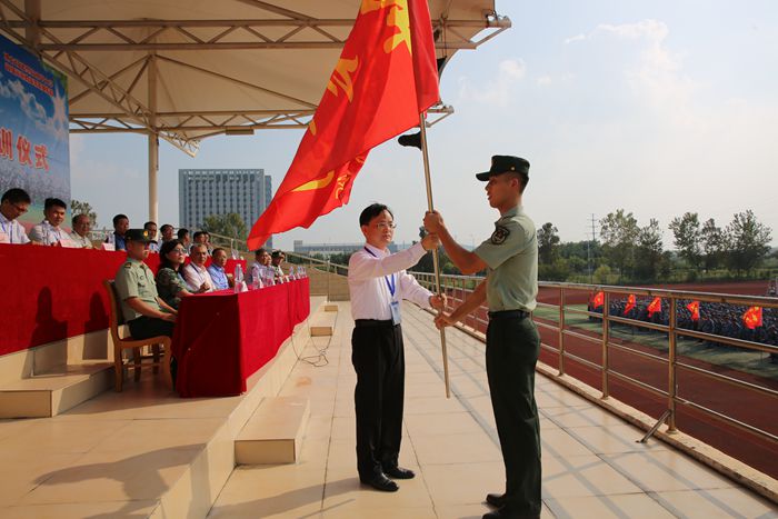 大会在庄严雄壮的国歌声中拉开帷幕。党委书记石象斌向承训部队授军训团团旗,标志着2021级新生为期两周的军训正式拉开帷幕。