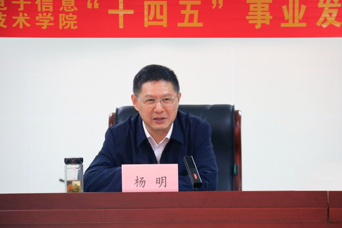 杨明代表安徽省经济和信息化厅对各位专家百忙之中参加学院“十四五”事业发展规划论证会表示感谢。他指出学院“十四五”事业发展规划要全面贯彻党中央、省委决策部署,落实好全国全省教育大会精神,结合我省高等职业教育的总体布局,切实发挥学院在电子信息领域的特长、特点和特色,培养更多优秀的高素质技术技能人才,更好地服务安徽“三地一区”建设和制造强省发展战略。同时他要求学院要按照专家组讨论意见进一步完善规划、健全规划,抓好规划的组织实施,建立健全监测评估机制,确保规划实施落实落细。