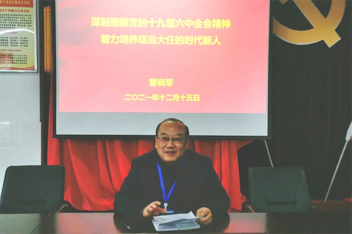 本网讯 为深入学习贯彻党的十九届六中全会精神,12月15日下午,经济管理学院党总支书记曹晓军为全院教师做了一场以“深刻理解党的十九届六中全会精神 着力培养堪当大任的时代新人”为主题的党课报告。