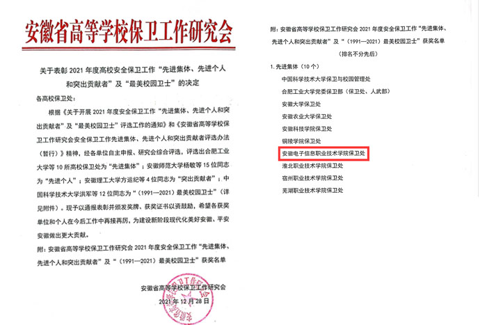 本网讯 近日,学院保卫处从全省一百余所参评高校中脱颖而出,被安徽省高等学校保卫工作研究会评为“2021年度安徽省高等学校安全保卫工作先进集体”,全省获此殊荣的高校共10所。