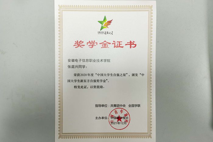 本网讯 近日,由共青团中央、全国学联指导,中国青年报社、新东方教育科技集团联合开展的2020年度“中国大学生自强之星”奖学金评选活动结果揭晓。我院信息工程学院计算机应用技术2019级学生张庭兴荣获2020年度“中国大学生自强之星”荣誉称号,并获得“中国大学生新东方自强奖学金”。